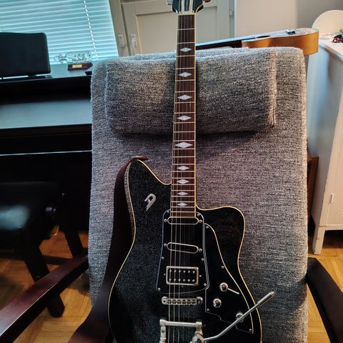 Vähäiselle soitolle jäänyt Duesenberg Starplayer tarjolla. Itse ostanut muusikoiden.netistä ja huoltanut noin vuosi sitten. Edellinen omistaja oli laittanut mm. varaosavirittimen alkuperäisen paikalle (kts. ruuvin jälki lapakuvassa) ja korjasin tämän. Ostin myös alkuperäisen laukun kitaralle.