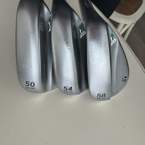 Callaway MD3 (Jawsin edeltäjä) wedget 50&54 asteiset, 10 bounce S- Grindi. Nämä kuluneemmat kuin lob wedge. Kierroksia vielä kuitenkin edessä. Gripit alkuperäiset UTX lamkinit.