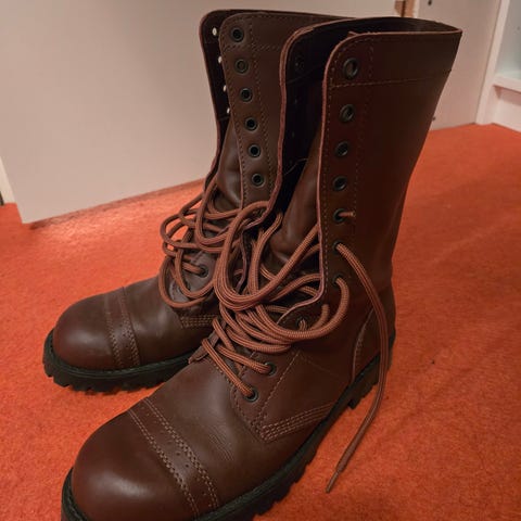 Hinta-laatusuhteeltaan erinomaiset saksalaisten laskuvarjojääkäreiden vanhemman kenkämallin mukaisesti tehdyt, teräskärjellä varustetut varsikengät, "maihinnousukengät" tai "maiharit".