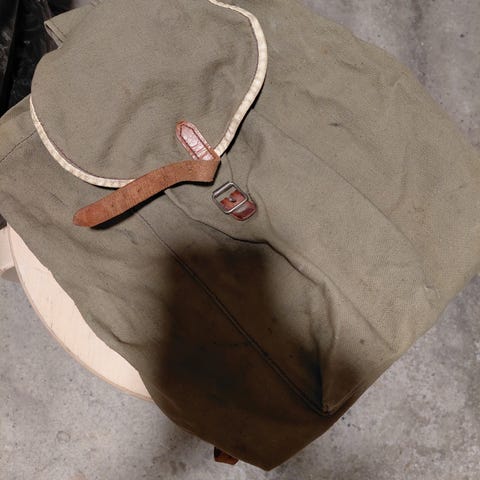 Tämmöinen perinteinen metallirankainen suhteellisen iso puuvillareppu, joka on päällystetty sisäpuoleltaan vissiin ihan vinyylillä. Kolme ulkoista taskua, kaikki remmit nahkaa. Keskimmäisen ulkoisen taskun läpän ompeleet vähän auenneet toisesta päästä, helppo korjata.