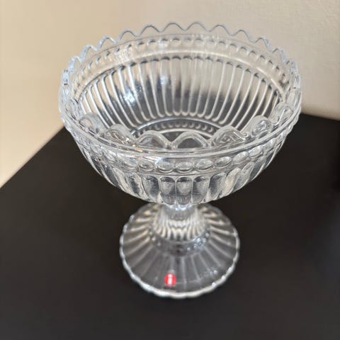 Iittalan Mariskooli. Sopii esimerkiksi jälkiruokien, hedelmien tai pienten tarjoiltavien esillepanoon. Materiaali on lasia ja kulhussa on Iittalan punainen logotarra.