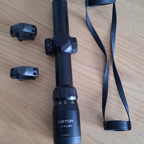 Mukaan erilaisia adapterilevyjä, joilla saa sopimaan varsin kattavasti eri pistooleihin, tai vaikka kivääriin.