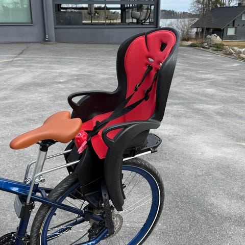 Lastenistuin pyörään. Täysin ehjä, adapteria ei ole. Niitä myynnissä kaupoissa ja Torillakin. Juuri pesty pehmusteet, jotakin ulkoa tullutta tahraa on edelleen.