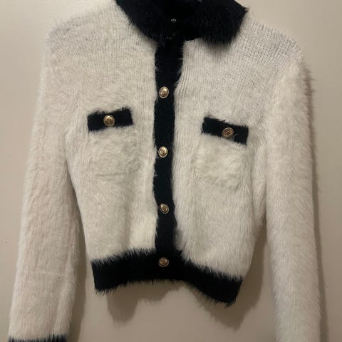 Maje neuletakki naisille, koko M. Kirjava mustavalkoinen neulos, jossa kontrastiväriset mustat ja vaaleat reunukset sekä etutaskut. Materiaalina puuvilla. Avoin malli ilman napitusta, sopii kerrospukeutumiseen arkeen ja vapaa-aikaan.