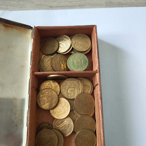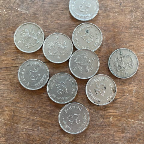Hopeanväriset pienikokoiset kolikot, yhteensä 8 kappaletta. Molemmilla puolilla on kohokuvioituja yksityiskohtia, kuten tekstiä ja symboleja. Sopivat esimerkiksi keräilyyn, rekvisiittaan tai askarteluun. Materiaali ei tarkasti tiedossa, mutta ulkonäöltään metallinen ja hopeanvärinen. Saa tarjota ja vain nouto hp 5€