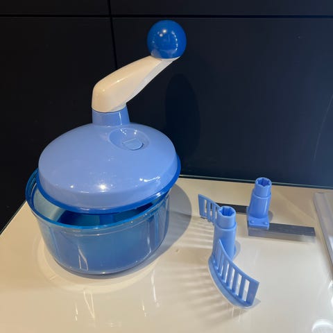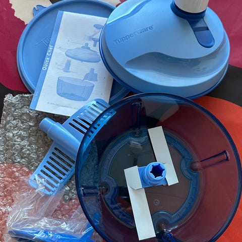 Tupperware Quick Chef monitoimileikkuri/vatkain. Käsikäyttöinen keittiöväline vihannesten, hedelmien ja muiden raaka-aineiden pilkkomiseen ja sekoittamiseen. Pakettiin kuuluu kulho, kansi kampimekanismilla, teräosa sekä lisäosat ja käyttöohjeet. Soveltuu esimerkiksi silppuamiseen, sekoittamiseen ja kevyeseen vatkaamiseen kotikeittiössä.