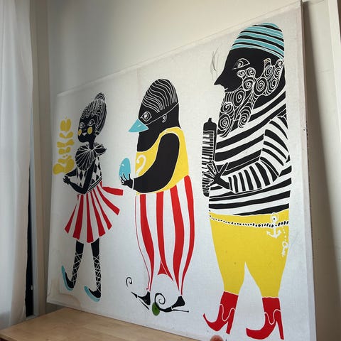 Maija Louekarin Karkuteillä-kuosi kehystettynä. Leveys noin 131 cm, korkeus 121 cm. Nouto Kuivasjärveltä.
