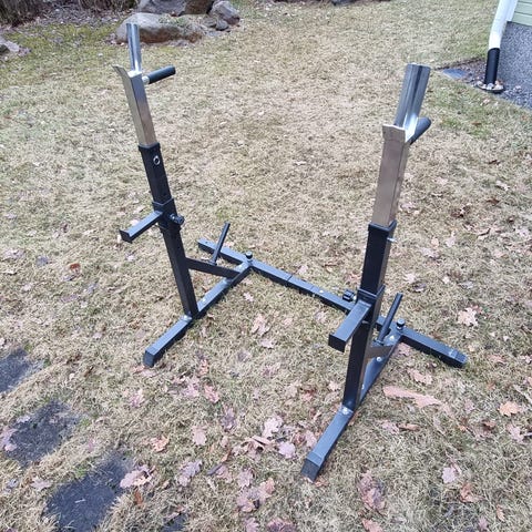Hyvä ja kestävä kyykkyteline, kestää isommatkin raudat. Minun pituuteni 180cm ja ylin korkeussäätö riitti hyvin. Maali lohkeillut jostain, ruostetta ei kuvia otettaessa ole, mutta siirsin ulos odottamaan ostajaa.
