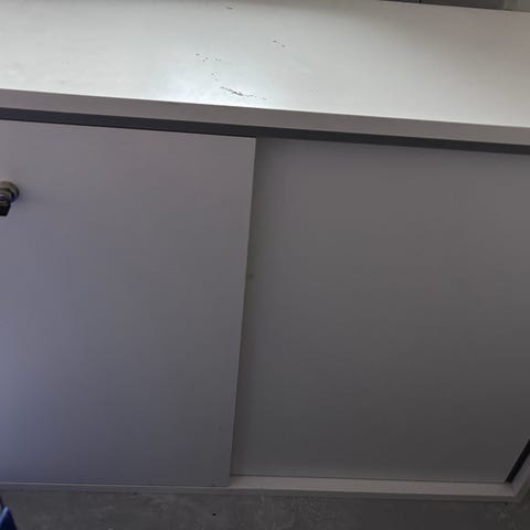 Varmaan lastulevystä tehty laatikosto. Ottanut kolhuja ja päällä olleiden kukkaruukujen liikakastelu rypistänyt maalia.