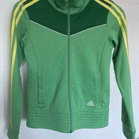 Musta takki, jossa valkoiset Adidasin kolme raitaa hihoissa ja pieni logo rinnassa. Vetoketjukiinnitys edessä ja vetoketjulliset sivutaskut. Joustavat resorit helmassa ja hihansuissa. Kai-kai 48 cm ja pituus 60 cm.