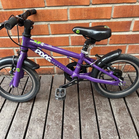 Kevyt ja laadukas pyörä pienelle polkijalle. Käytön jälkiä on, etenkin jarrukahvoissa ja tankotupeissa mutta täysin toimiva pyörä. Mukana soittokello ja toiset pienemmällä kuviolla olevat renkaat.