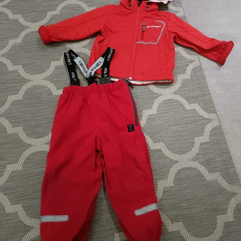 Myydään Polarn O. Pyretin välikausitakki ja -housut, joko yhdessä tai erikseen. Molemmat kokoa 98 cm (2-3 v). Takki kuin uusi (pientä tummumaa) ja housut käytetymmät (polvissa kulumaa (kts. kuva) ja jalkalenksut puuttuu kuin myös muutama nappi). Takki enemmän korallin värinen kuin oranssi (kts. kuva takista yksinään, väri vastaa siinä enemmän todellisuutta).