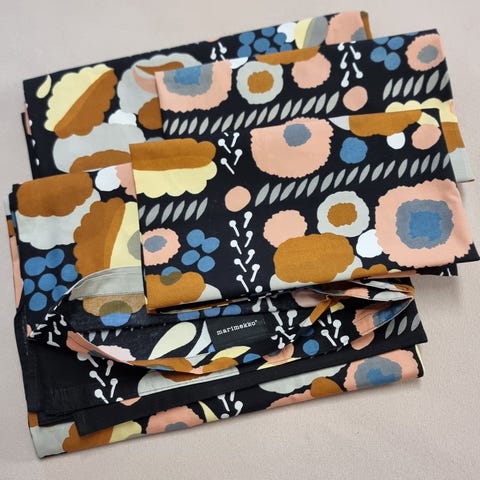 Marimekon pussilakana 150x210 cm ja tyynyliina 50x60 cm, väri oranssi/vaaleanpunainen. Tuotteet sisältävät 75 % luomupuuvillaa ja 25 % kierrätettyä puuvillaa. Tuottet pakattu samasta kankaasta valmistettuun kangaspussiin. Käyttämättömät.