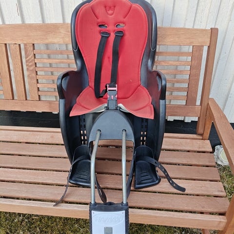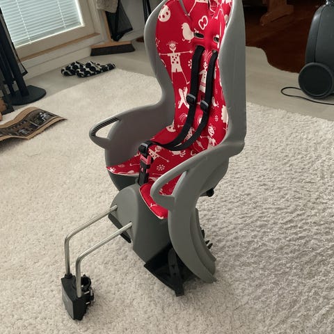 Hamax lasten pyöränistuin, enimmäiskuormitus 22 kg. Istuimessa on harmaa runko ja vihreä pehmuste sekä säädettävät jalkatuet ja turvavyöt. Kiinnitys tapahtuu mukana tulevalla runkokiinnikkeellä polkupyörän runkoon, näitä kiinnikkeitä mukana 2 kpl. Pehmustetta ei ole pesty ja se on hieman tummunut. Muilta osin moitteeton kunto. Ostettu meille uutena, käytetty kahdella lapsella. Säilytetty sisällä kuivassa.