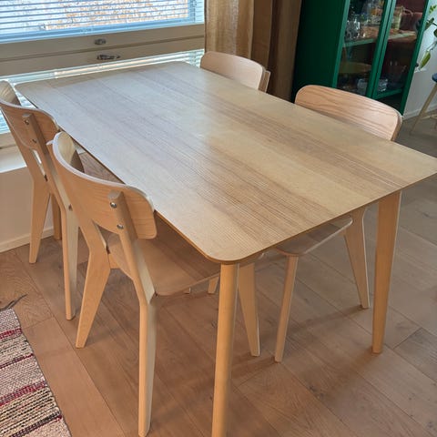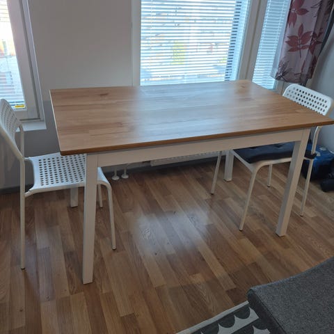 Myydään Ikean ruokapöytä ja 4 tuolia, Lisabo-merkkiä. Pöydän mitat 78cm x 140cm. Kuvassa näkyy, että pöydän pinnassa on muutama kohouma, mutta ei haittaa käyttöä ja yleisilme siisti. Neljä tuolia samaa sarjaa.
