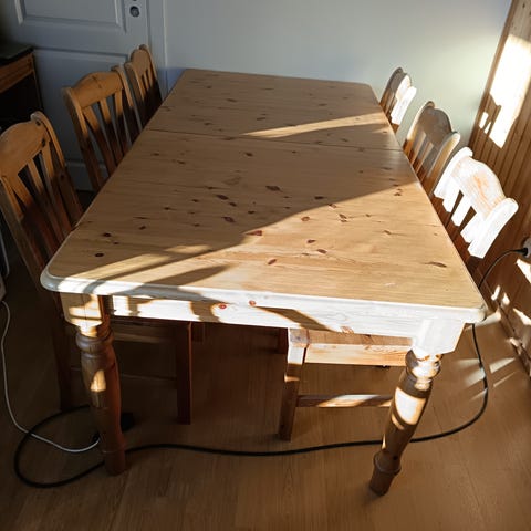 Hyvässä kunnossa oleva pöytä ja kuusi tuolia.