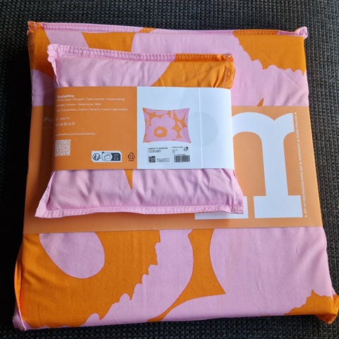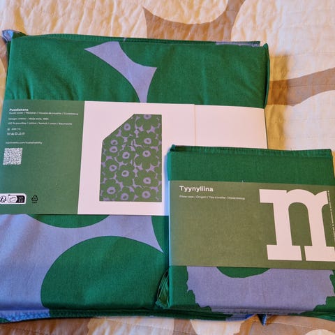 Marimekon pussilakana 150x210 cm ja tyynyliina 50x60 cm, väri hiilenharmaa/ luonnonvalkoinen. Käyttämättömät, alkuperäispakkauksessa. Hinta yhdelle setille 110€. Myynnissä kaksi settiä. Jos ostat molemmat hinta 210€.