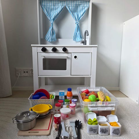 Hyväkuntoinen leikkikeittiö odottaa uutta käyttäjää. Siisti ja toimiva.