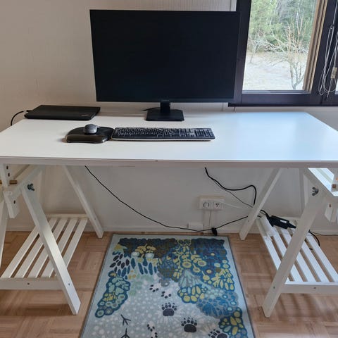 IKEA työpöytä, jossa bambupintainen pöytätaso ja musta laatikosto 5 laatikolla. Laatikosto on erillinen/irrallinen ja pöytälevy lepää sen päällä. Mustassa sivukaapissa on näkyvissä naarmuja ja kulumaa, jotka on kuvattu ilmoituksen kuvissa. Pöytälevy virheetön. Yleisilme siisti.