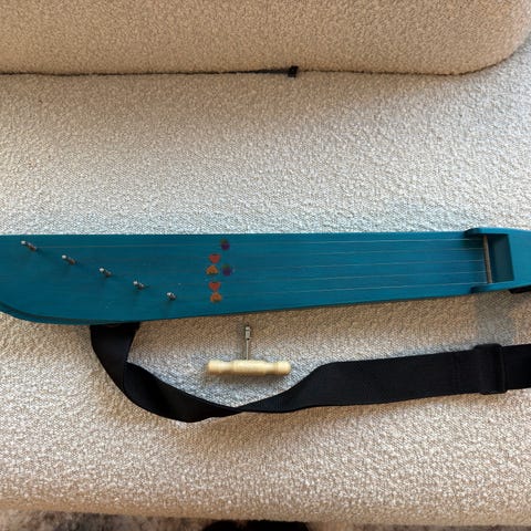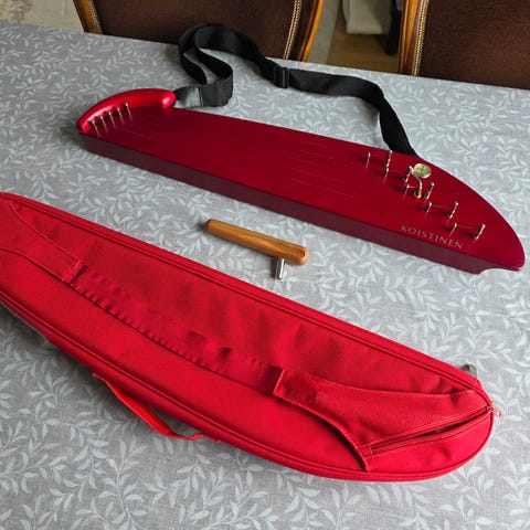 Melodia soittimen punainen 5-kielinen muskarikantele. Mukana kuljetuspussi, viritystyökalu, yksi varakieli ja kantohihna. Mansikka- ja mustikkatarrat liimattu, saa tarvittaessa pois. Hyvin vähän käytetty kantele.