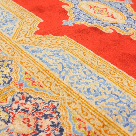 Kunto: Ehjä ja tahraton. Kohtalaista, paikoin kovempaa, käyttökulumaa (katso lähikuvat). Päätyjä pienin paikoin korjattu (katso lähikuva). Matto on ollut kotieläintaloudessa ja siinä saattaa olla vähäisiä karvajäämiä.