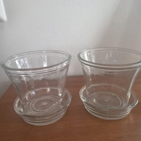 Myydään hyvä orkidearuukku aluslautasella. Ruukku on kirkasta lasia.