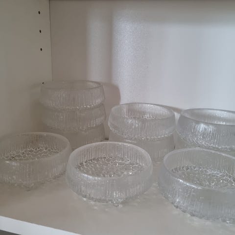 Taiteilija Tapio Wirkkalan v.1968 suunniteleman Ultima Thule-sarjan jälkiruokamaljat.