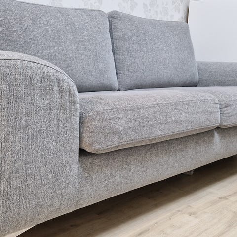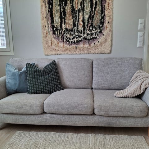 Siisti ja hyväkuntoinen 3-istuttava harmaa sohva. Ostettu Askosta vuonna 2019. Sekä istuin- että selkätyynyjen päälliset voi irrottaa ja pestä. Selkätyynyt käännettävät. Leveys n. 218cm, istuinleveys n. 160cm, rungon korkeus n. 67 cm.