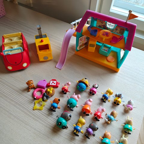 Pipsa Possu leikkitalo ja figuurit. Myynnissä kerroksellinen Pipsa Possu -aiheinen leikkitalo, jossa useita huoneita ja irrotettava kylpyamme. Mukana tulee useita Pipsa Possu -hahmoja sekä muita pienikokoisia figuureja ja poneja, jotka sopivat roolileikkeihin talon kanssa. Leikkitalo ja hahmot on tarkoitettu lasten leikkeihin sisätiloissa.