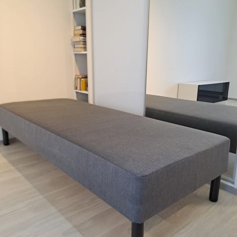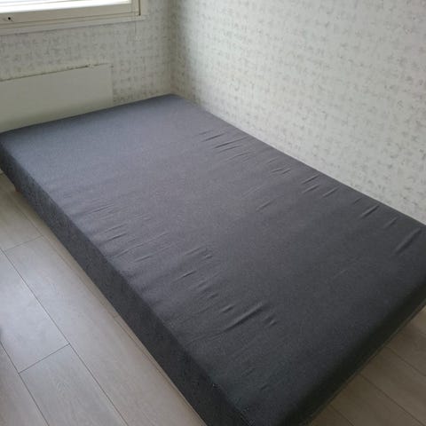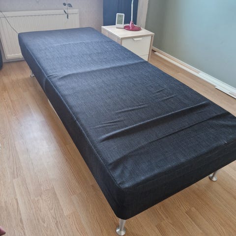 Hyväkuntoinen vierashuone käytössä ollut sänky. Sängyssä pussijousitus ja puurunko, tilattu sijauspatja josta tikatun päällisen saa irrotettua ja on konepestävä .