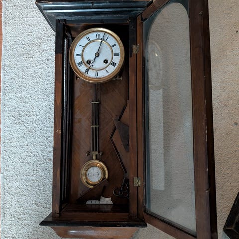 Annetaan nopeimmalle hakijalle seinäkello. Tuntiviisari hieman liikahtanut pois paikaltaan (kts. kuva). Pieniä käytön jälkiä. Nouto Munkkiniemestä.