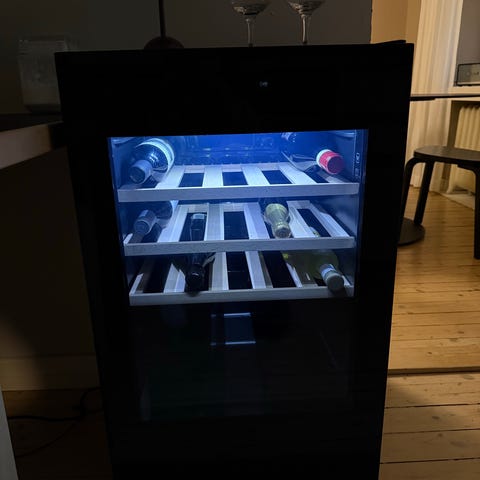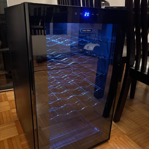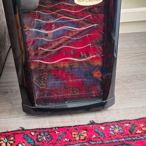 Myydään pieni viinikaappi. Toimii, mutta ei aivan uusinta mallia. Lämpötila säädettävissä.