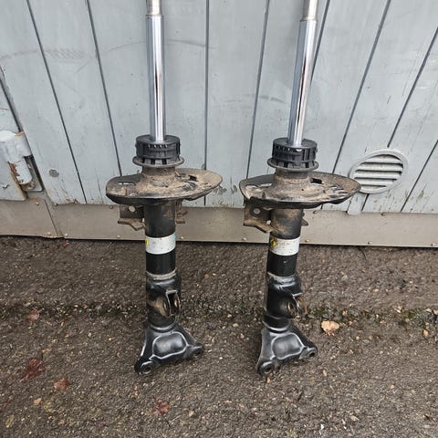 Mercedes-Benz iskunvaimentimet taka-akselille. Kaksi kappaletta, kuvissa näkyvillä alkuperäisillä tarroilla ja osanumeroilla.
