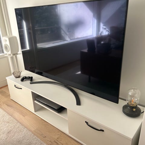 Myydään kiiltävä valkoinen tv-taso. Taso on hyvässä kunnossa, pinnassa pientä kulumaa.