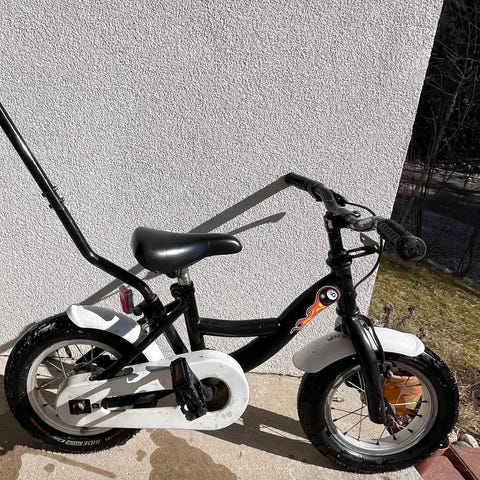 Hyväkuntoinen pyörä. Mukana työntökahva ja apupyörät.