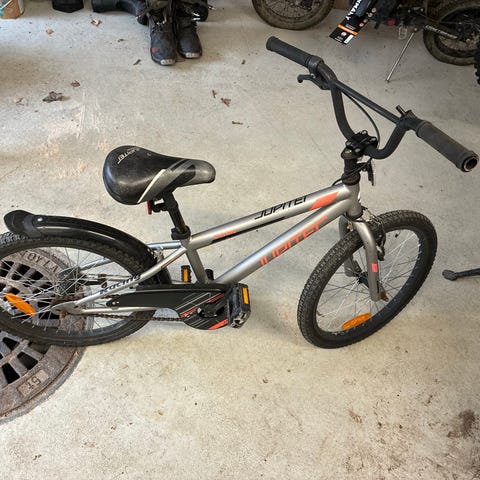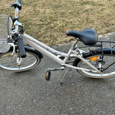 Lasten 3-vaihteinen polkupyörä, jossa 20" myös maastoon sopivat renkaat. Rungon väri on valkoinen vihreillä korostuksilla. Pyörä sopii niin koulumatkoille kuin vapaa-aikaan maastoon. Pyörässä on suora ohjaustanko ja satula, joka on säädettävissä ajajan pituuden mukaan. Satulan putki aavistuksen väljä. Itse olemme kiristäneet sen paikalleen teipillä, mutta pysyvämmän ratkaisun saisi vaihtamalla putken pätkän.