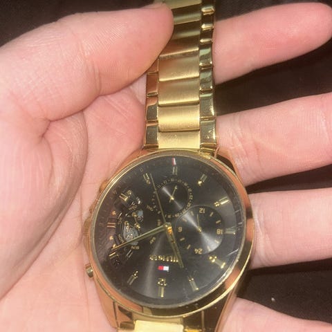Tommy Hilfiger miesten rannekello, jossa kultainen metalliranneke&musta kellotaulu. Kellossa analoginen näyttö + useita pienempiä osoitinnäyttöjä mm, kk ja päivä+mini kellotaulu sisässä 1-24H. Ranneke on lenkkimallinen saden kestävä metalliranneke taittolukolla.