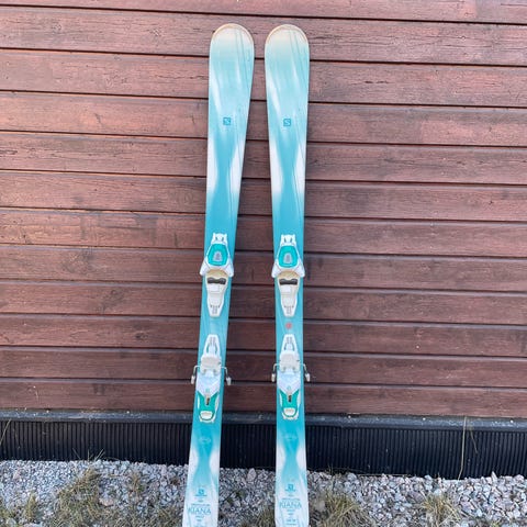 Vähän käytetyt Salomon Kiana laskettelusukset siteillä turkoosi-valkoinen