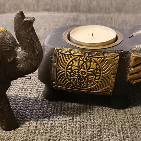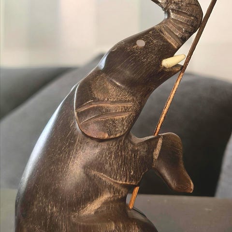 Myydään kaunis ja yksityiskohtainen norsunfiguuri, joka on tuotu Intiasta noin 30 vuotta sitten. Alaspäin suunnattu kärsä symboloi intialaisessa perinteessä nöyryyttä, voimaa ja kodin vakautta.