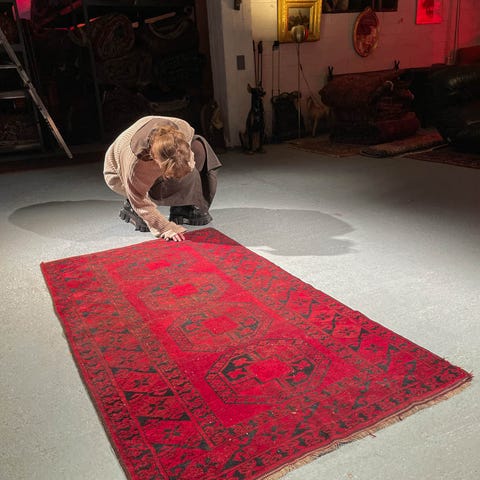 Aghan itämainen matto, jossa on monimutkainen geometrinen kuviointi punaisen, mustan ja oranssin sävyissä. Maton koko on 96cm x 177 cm.