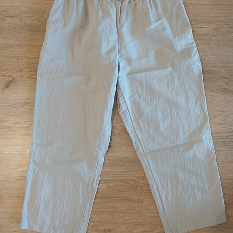 Täyspitkät lahkeet ja yksinkertainen kuminauha vyötäröllä. Suorat, väljät lahkeet ja kätevät sivutaskut. Lankavärjättyjen raitojen värit sointuvat toisiinsa luoden monikäyttöisen raidallisen kankaan.