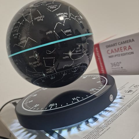 Telineessä asteikko, leveyspiirit, kuussa pituuspiirit. Pallon halkaisija n. 15 cm.