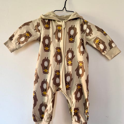 Vauvan pehmeä hupullinen haalari. Ruskean värinen, nallekuosi.
