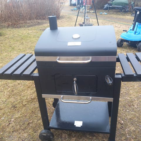 Hiiligrilli Ø 54 cm on EN1860-standardin mukainen hiiligrilli. Rungossa on pulverimaalattu teräs ja emaloitu kupu sekä hiilikaukalo. Grillin koko on leveys 1315 mm ja syvyys 630 mm, grillialueen halkaisija on 540 mm. Grillissä on sivutasot molemmin puolin, korotettu paisto ritilä ja lämpöhylly. Galvanoitu hiiliritilä (6 x 6 mm) ja kannessa lämpömittari. Grillissä on kaksi pyörää siirtämistä varten. H 125€ KPL. KAIKKI KOLME 340€.