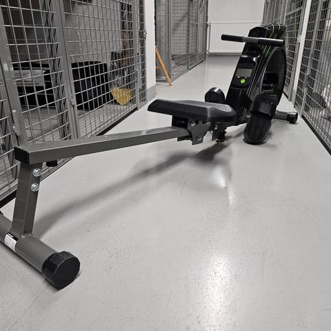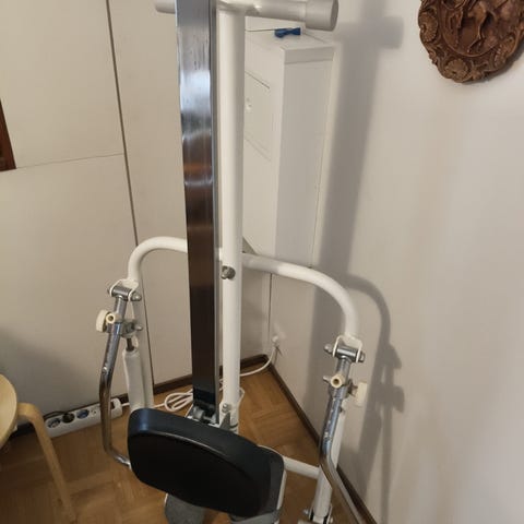 Laitteessa on liukuva istuin, jalkatuet remmeillä sekä käsikahvat (mukaan saa yhtenäisen tangon ja erilliset kahvat). Mukaan saa myös maton, joka estää liikkumisen.