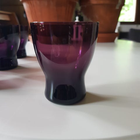 Vanhat, värilliset Marja liköörilasit (5 kpl) Nuutajärven lasilta, suunnittelija Saara Hopea. Tuotannossa ehkä 1950- 1970-luvulla. Pakkaus tallella. Lasit ovat hyvässä kunnossa.