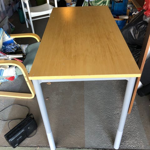 Tukevarunkoinen kokoontaittuva pöytärunko. Lastulevypinta jo aikansa palvellut, mutta tärkein eli runko hyvässä kunnossa.