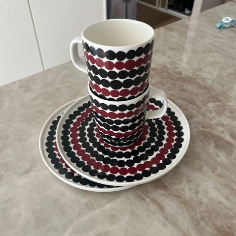 Myydään Siirtolapuutarha-sarjan korvattomia kahvikuppeja 2 kpl sekä Räsymatto-sarjan teemuki 1 kpl.