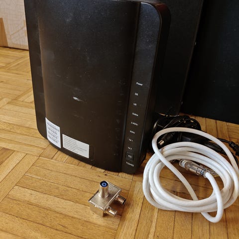 Modeemin mukana tulee antennikaapeli, ethernet kaapeli, käyttöohjeet ja alkuperäinen virta-adapteri.