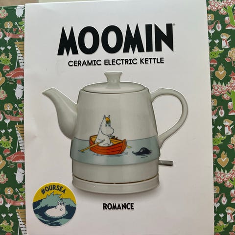 Keraaminen Muumi-vedenkeitin. Automaattinen virrankatkaisu ei aina toimi odotetusti, todennäköisesti katkaisimessa jotain vikaa. Saattaa lopettaa lämmittämisen jo alkuvaiheessa (jolloin täytyy napsauttaa uudelleen päälle, jotta lämpiäminen jatkuu) ja toisinaan ei sammu automaattisesti kiehumispisteen jälkeen (eli täytyy napsauttaa itse pois päältä).